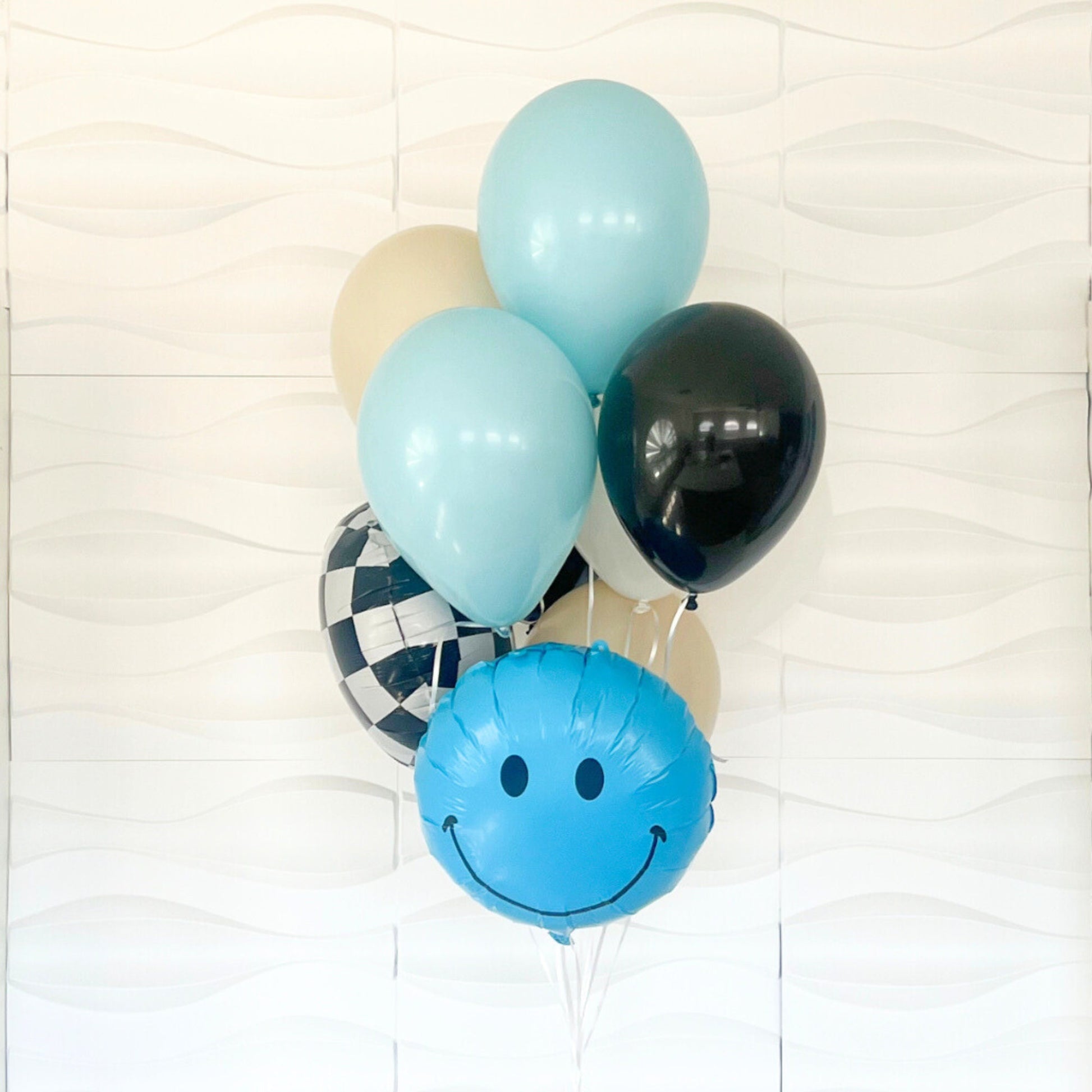 Comes with: 8 11inch balloons, 1 checkered foil balloons, 1 smiley face balloons, string.